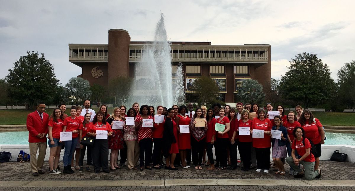 After tabling all day, the volunteers took the time to pose and pay homage to Rosie the Riveter, a fitting icon for the day’s events. Throughout the day students were invited to the reflecting pond at 4:15 p.m. to take a group photo marking the day and support for the UCF community.
